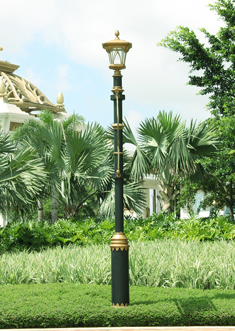 庭院路灯,高度3-8米,灯杆采用铁制品描金色工艺,顶部配好特色庭院灯具。光源可配节能灯,LED ,钠灯 ,金卤灯等。