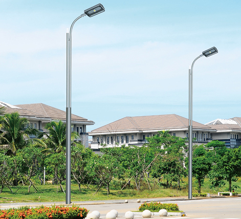双杆路灯,高度6-12米,采用Q235钢材整体内外热镀锌,光源采用美国普瑞芯片。光源规格为 60W 80W 100W 120W 150W 180W