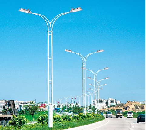 双杆路灯,高度6-12米,采用Q235钢材整体内外热镀锌,光源采用美国普瑞芯片。光源规格为 60W 80W 100W 120W 150W 180W